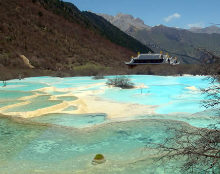 時間や天気、光の射し込み方によって様々な色を映し出す様は、黄龍の中でも最も美しいと言われる。