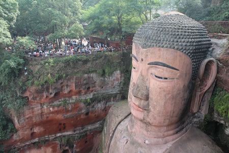 岷江の氾濫による水害を鎮めるために、唐の時代である713年に、凌雲寺の僧である、海通が建立を思い立ち、民衆を集め、物資を募ったという歴史がある大仏。90年の年月を要し、803年に、高さ71m、肩幅28m、東部の直径10mという世界最大の石刻座仏が完成。1200年以上もたった今でも岷江の流れを静かに見守り続けている。