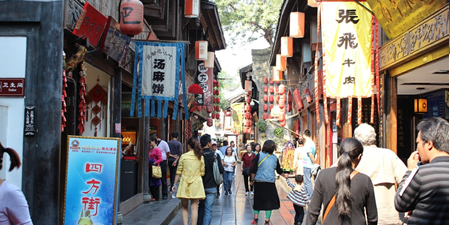 古き時代の成都の街並みには、レストラン、茶館、名産品店も多くあり、成都小吃を楽しむ観光客で常に賑っている