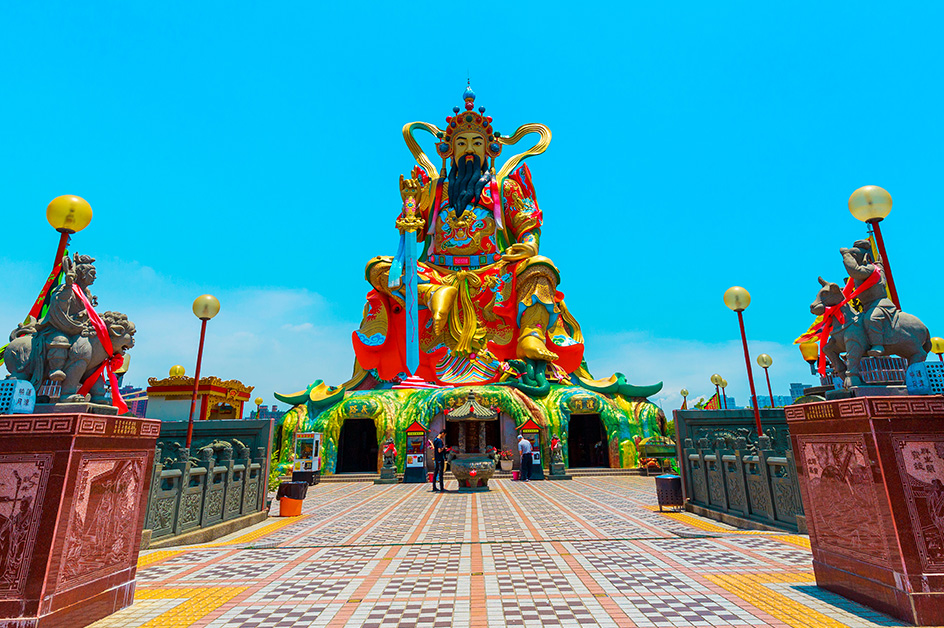 「龍の口から入り、虎の口から出ると悪行が帳消しになる」という云われがある「龍虎塔」その奥には極彩色に輝く七重塔が二あり、高雄屈指のパワースポットとして人気の観光地