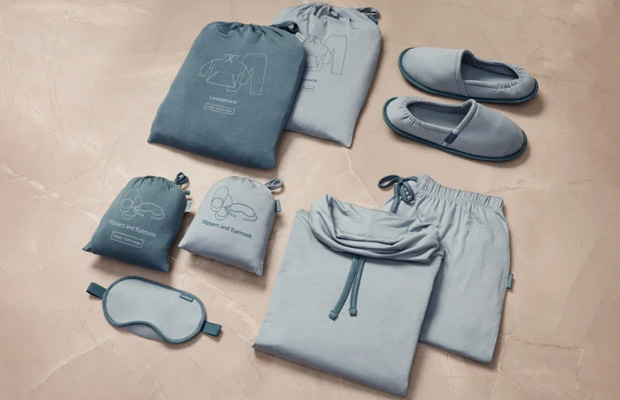 2024年2月1日よりビジネスクラスをご利用のお客様向けのアメニティとして、画期的なデザインのラウンジウェアセットの提供を開始しました。9時間以上のフライトのビジネスクラスのお客様にはルームウェアのトップスとパンツ、スリッパ、アイマスクのフルセット、2時間半~9時間のフライトのビジネスクラスのお客様にはスリッパとアイマスクのセットをご提供します。