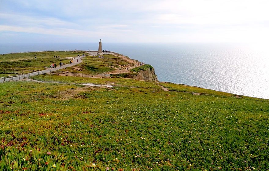 シントラ近郊にあるロカ岬はユーラシア大陸最西端。「ここに地果て、海始まる」と書かれた石碑を背景に、雄大な風景をご覧いただけます。