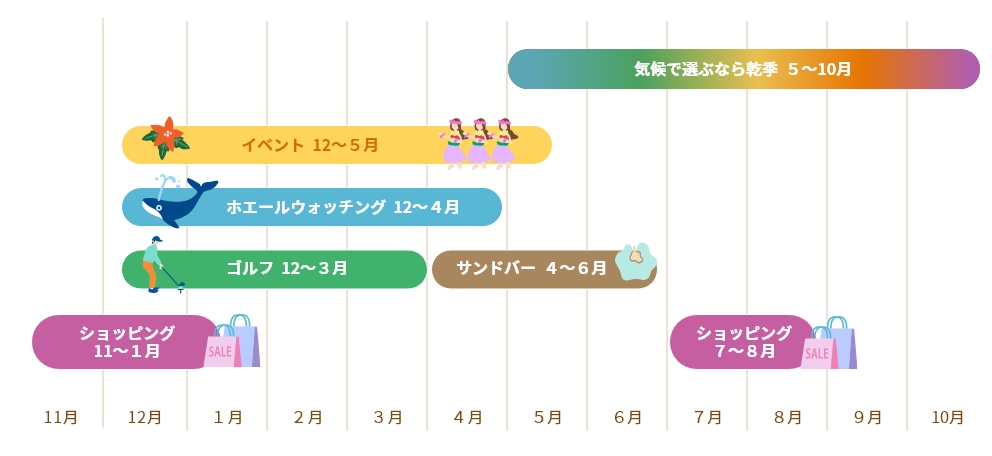 イベントシーズンを狙うなら1〜5月、ゴルフなら12〜3月、と目的に応じておすすめのシーズンがありますので、ぜひ参考にしてみてください。