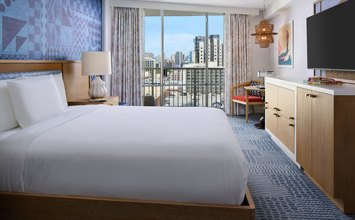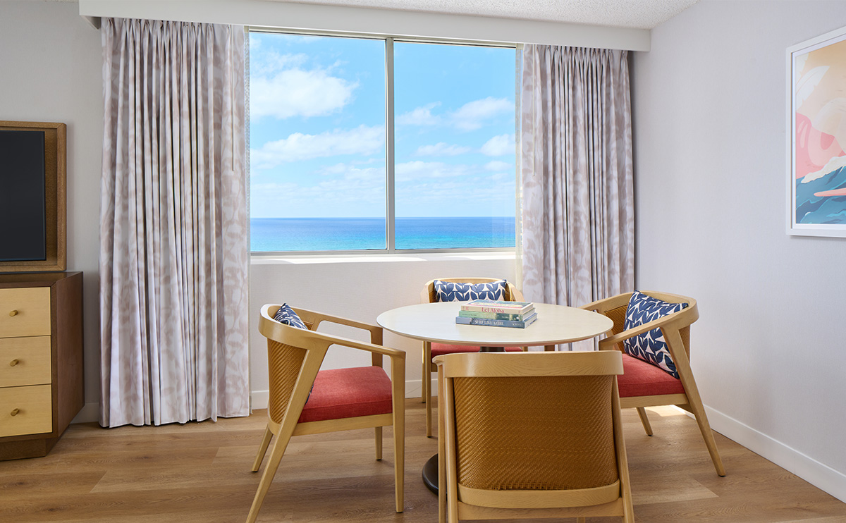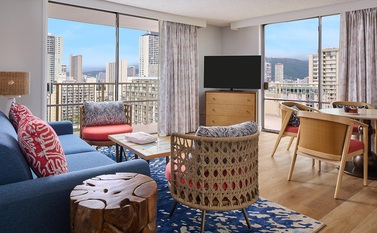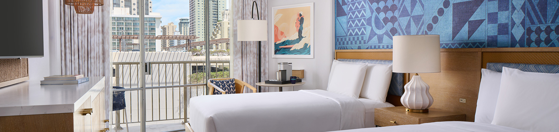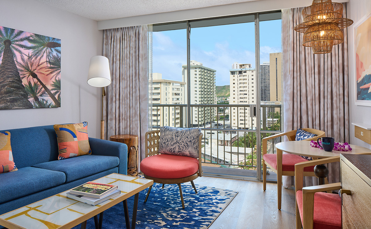 ワイキキの中心に立つロケーションは、どこへ行くにも便利。ホテル内には、ワイキキの日本食の名店「田中オブ東京」など、レストランやコーヒーショップがあります。そのほか、ギフトショップ、フィットネスセンター、会議室など、ホテルに必要な施設を備えています。通りを挟んだ向かい側には、2023年1月オープン「ワイキキマーケット」、隣にはインターナショナル・マーケットプレイスがあります。