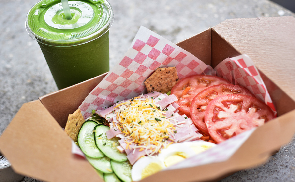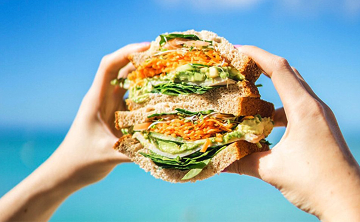 お野菜たっぷりのサンドイッチ、スムージーやサラダをテイクアウトできます。ビーチに行くなら、軽食と冷えたドリンクをお忘れなく。