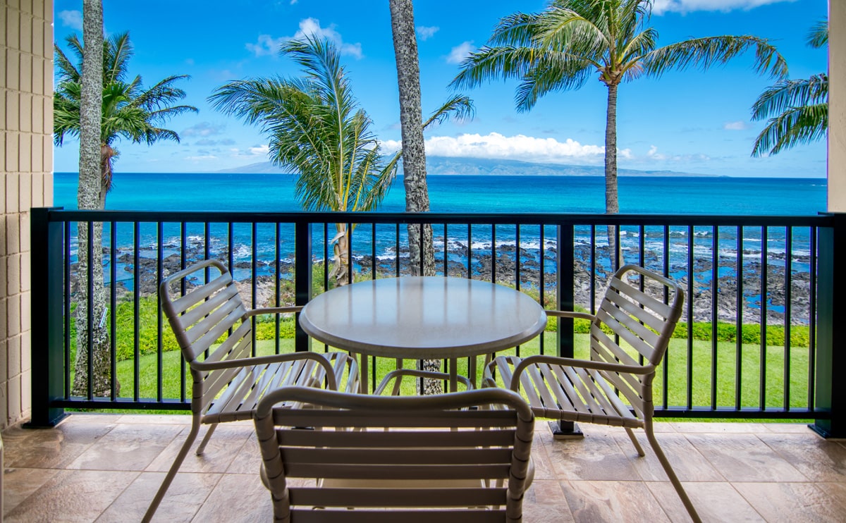 遠くにラナイとモロカイの島影を望む、オーシャンフロントのコンドミニアム