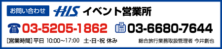 お申込みはH.I.S.イベント営業所のみの受付となります。 H.I.S.他店舗での申込みはできませんので予めご了承ください。