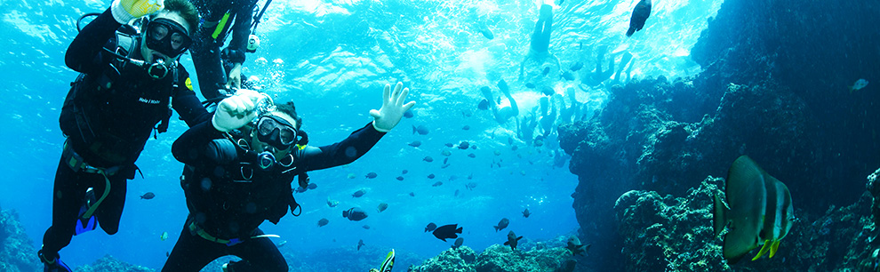 沖縄本島のダイビングスポットといえば、北部恩納村にある真栄田岬の崖の下、青の洞窟が有名です。海面を照らす青い光のきらめく美しさもさることながら、生息する魚の種類やサンゴの種類の豊富さは、初心者の方から上級者の方まで多くのダイバーを魅了してやみません。世界でも有数の透明度を誇る慶良間諸島へは本島からのツアーも出ており、冬にはホエールウォッチングも可能。超上級者の方は、沈船ダイビングが楽しめる古宇利島もおすすめです。