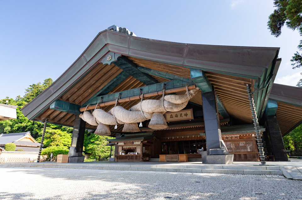 全国の神々が集う大いなる社、出雲大社は島根に来たら一度は訪れたい場所です。出雲大社は縁結びの神・福の神として名高いことで有名です。正面には日本最大級の大しめ縄があり、縁結びのご利益を願って全国から多くの参拝客が訪れます。