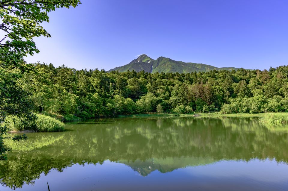 利尻島北側の原生林に囲まれた神秘的な「姫沼」。沼を一周できる探索路もあり、トレッキングに最適。晴れた日には美しい「逆さ利尻富士」を見ることができます。