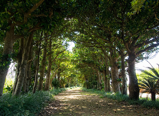 昔、塩川村の百姓が霊石が二個飛来してきてその場所に鎮まったのを見て、草木を植えめぐらし御嶽を建てたと言い伝えられています。鳥居をくぐるとその先に赤瓦のほこらがあり、その周囲にはフクギをはじめテリハボクやリュウキュウコクタン、アカギなどがうっそうと茂っています。フクギ並木は沖縄県の天然記念物に指定されていて、防風林の役割を果たしています。