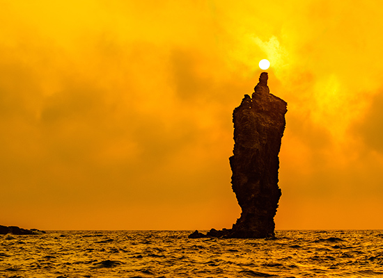 - 島後の北西の沖合に海から約20mの高さでそびえ立つ奇岩ローソク島。夕陽に合わせて出港する遊覧船も運行しています。