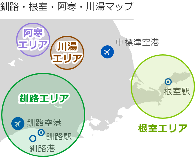 - このエリアの観光には、たんちょう釧路空港、女満別空港、釧路中標津空港利用がおすすめです。阿寒湖までは釧路空港から車で約1時間10分、川湯温泉までは女満別空港から車で約1時間20分です。冬はバスやJR利用がおすすめです。