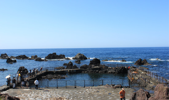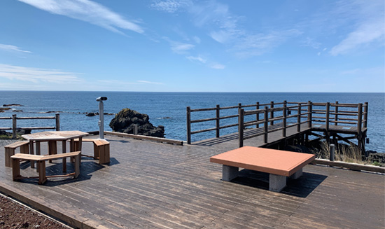 溶岩の地形を活かしてつくられたテラス。デッキからは青伊海や、打ち付ける波など、大自然の迫力を間近で見ることができます。