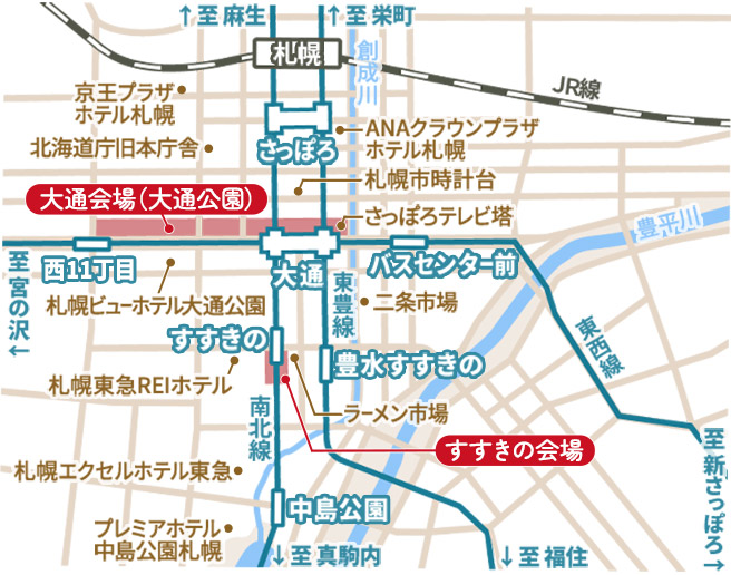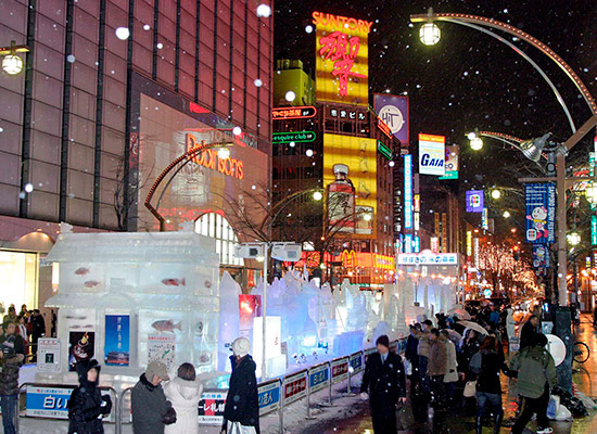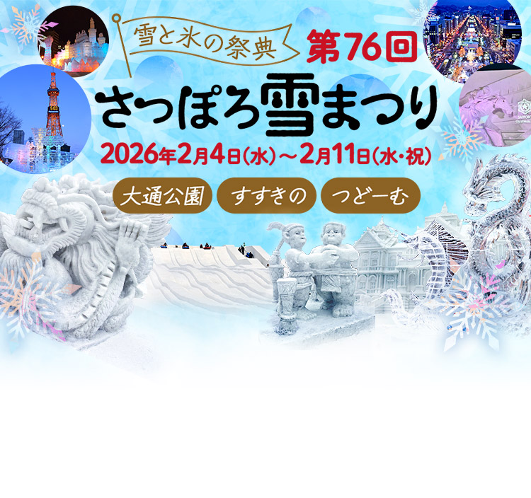 さっぽろ雪まつりは、毎年2月上旬に札幌中心部で開催される冬の一大イベント。有名な建築物やキャラクターを忠実・精巧に作った雪像が来場者を楽しませます。迫力ある大雪像が立ち並ぶ大通会場、幻想的な氷像が並ぶすすきの会場、雪体験コンテンツを中心に展開するつどーむ会場と、