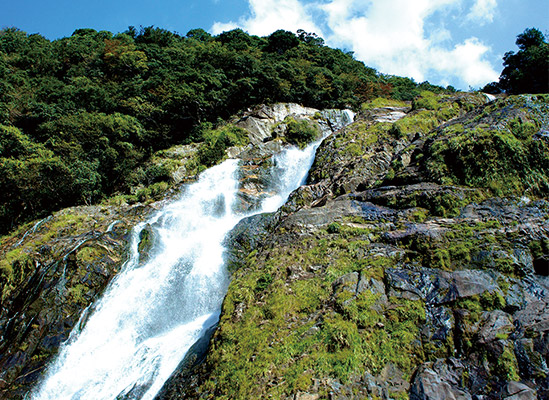 巨大な一枚の花崗岩と天然照葉樹林の中を落差60mの滝が流れ落ちる、とても優雅な滝。