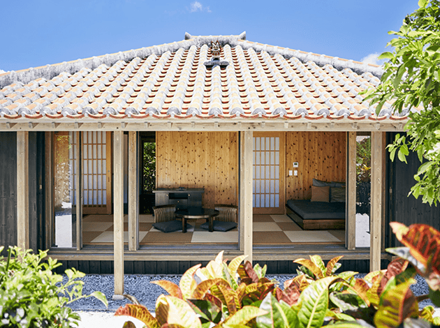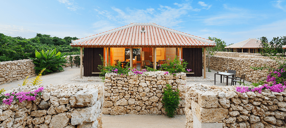 星のや竹富島は沖縄の伝統建築を踏襲した48棟の家々が連なる、竹富島4つ目の集落といわれています。家の周りを囲う「グック(石垣)」は、視線を遮るほどの高さとなっており、実際の集落と同じような住み心地を味わえます。どの客室も、大きく開け放てる窓を南側に設置しており、海から届く心地よい風が目いっぱい通り抜ける造りです。