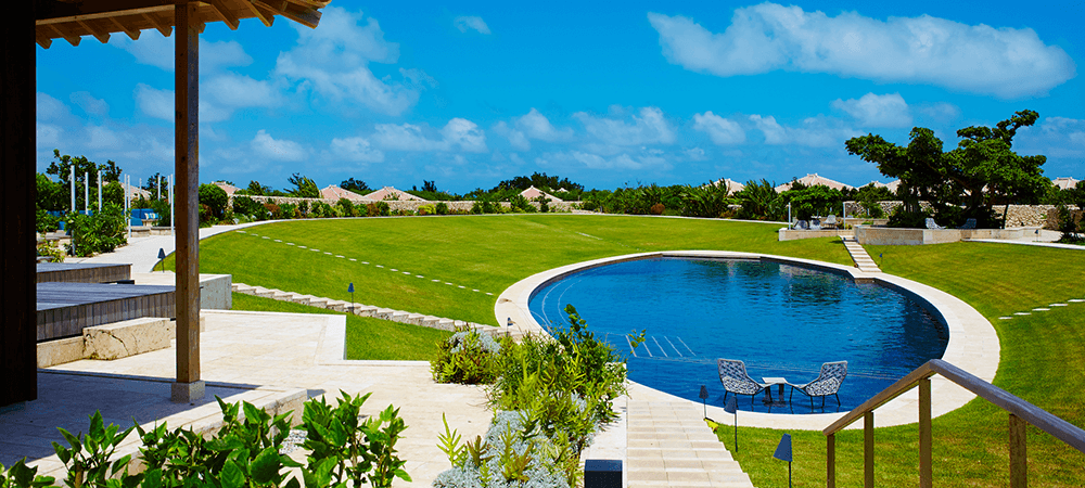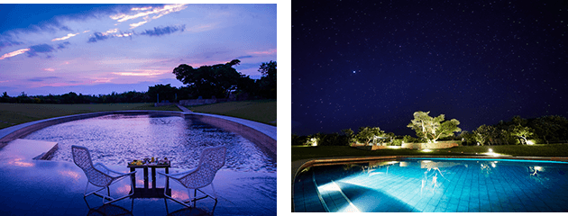 集落の中心にはすり鉢状の窪みがあり、庭には豊かな水をたたえたプールがあります。24時間、いつでもご利用いただける、開放感あふれる場所です。昼は視界いっぱいに広がる青空の下、水浴びをしたり、プールサイドでまどろんだり、夜には満天の星を望んだりと、竹富島の空に抱かれる時間をお楽しみください。