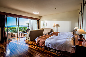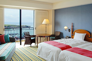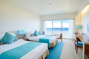 全室43㎡以上の広さを誇る客室は、全室バルコニー完備。バルコニーからは沖縄本島屈指の透明度を誇る珊瑚礁の海が望める。