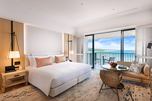 優雅な空間を確保するゲストルームは、沖縄最大級となる50m²の広さ。全360室の客室すべてが目の前に群青の海が迫るオーシャンビュー。贅沢の新たなスタンダードを具現化します。