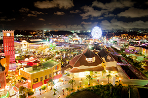 複数の商業施設やホテル、アミューズメント施設が集まるアメリカンビレッジ。海沿いにカフェや飲食店が並ぶシーサイドエリアは地元でも注目の的!