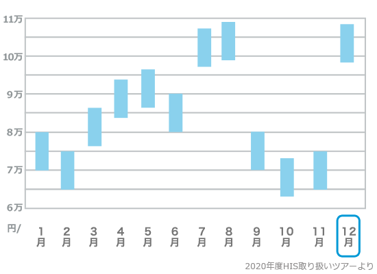 一見高いように見えますが、これは年末の旅行費用が平均を押し上げているためです。12月上旬~中旬まではかなりお得に沖縄旅行が楽しめる時期の一つでもあります。20日を超えるころからは年末にかけて旅費は急上昇。人気の12月29日~31日辺りにはゴールデンウィーク並みの費用になります。