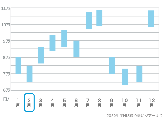 前半に連休が重なる1月よりは少し下がります。祝日の前後は高騰しますが、連休を避ければお得に旅行ができるでしょう。徐々に暖かくなってくる時期でもありますので、海水浴にこだわらない方であれば、非常にお勧めです。