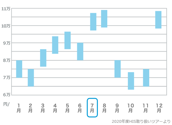 6月に比べると平均はぐっと上がりますが、これは海の日の連休から夏休みの価格が押し上げているので、7月の初旬はまだ6月とさほど変わらない費用で旅行することができます。後半の夏休みシーズンは1年でも最も旅費は高くなりますが、その分真夏のイベントなどで盛り上がることができますので、ベストシーズンの石垣島を存分に楽しんでください。