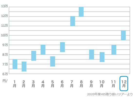 11月よりも高くなったように見えますが、これは年末の旅行費用が平均を押し上げているためです。12月上旬~中旬まではオフシーズンであるため、かなりお得に宮古島旅行が楽しめます。20日を超えるころから年末にかけて旅費は高騰。人気の12月29日~31日あたりにはゴールデンウィーク並みの費用になります。ただ、現地で年を越さずに、年内に帰ってくる旅程であれば、多少旅費は抑えられます。