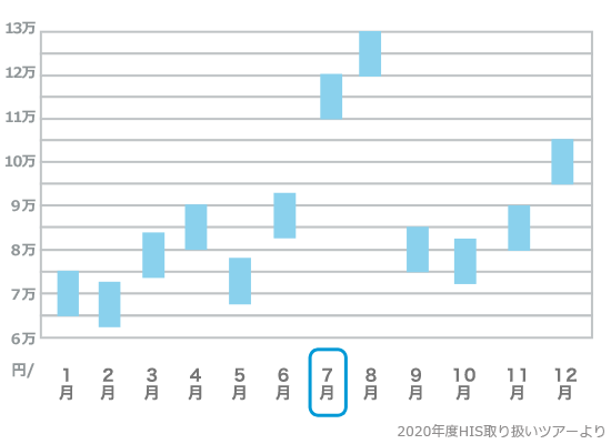 夏休みシーズンに突入する7月がぐっと旅費も上がります。海の日前後の連休からが特に上昇し平均旅費を押し上げていので、7月の初旬まではセールなどを利用し、10万円を大きく切ることも可能。トップシーズンなので、野外イベントも増え楽しい季節。多少旅費は高くともやっぱり人気です。