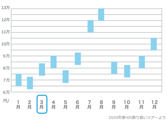 寒さが和らぎ気候が良くなるにつれ、旅費も上がっていきます。後半は春分の日や春休みがあるため、平均を押し上げますが、上旬であればまだ2月並みのお得な価格でツアーを探すこともできます。ちなみに現在沖縄本島から宮古島までのフェリーは就航していません。