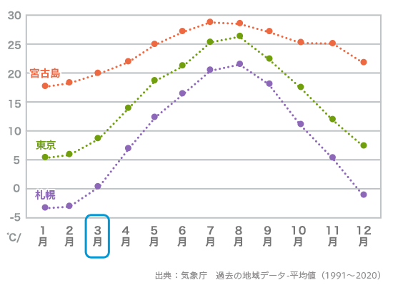3月に入ると平均気温が20℃を超え、天気の良い日は半袖で過ごせるようになります。
