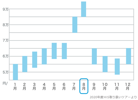 8月の前半~お盆前後にかけては1年で最も旅費が高く、安くても10万円を超えてくるツアーがほとんどです。安いからとレンタカーがついていないツアーを選ぶと、人が多い時期のため借りられなくなってしまう可能性もあります。レンタカーを利用するのであれば、レンタカー代金が含まれたツアーを早めに予約したほうが良いでしょう。8月も25日を過ぎると旅費も落ち着き、7~8万円台のツアーを探すことができます。