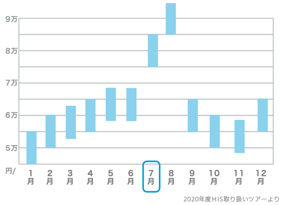 7月からは1年で最も人気のシーズンになりますので、旅費も上がってきます。特に「海の日」のあたりからは夏休みに突入することもあり、3日間のツアーで10万円を超えることも。ただ、7月前半であれば5~6万円台のツアーを探すことができるため、この時期に旅行を計画すると、ベストシーズンの沖縄を比較的格安で楽しむことができます。