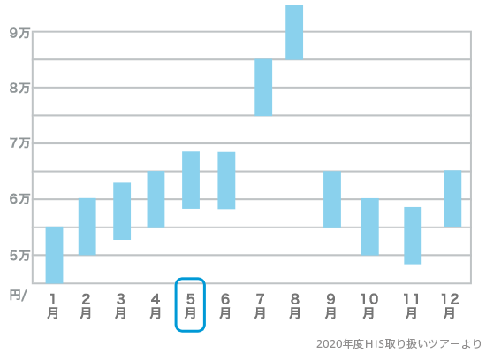 5月初めのゴールデンウィークは1年の中でも特に人気があるため旅費が高くなり、人気のフライトを選択すると10万円を超えてきます。しかしゴールデンウィークが終了すると一転、3万円台から5万円台と安くなるため、平均では上記のように落ち着きます。日程調整がつくならば、ゴールデンウィーク明けはかなりお得に沖縄旅行が楽しめます。