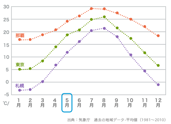 5月の後半からは梅雨の季節に突入。平均気温は25℃前後ですが、湿度が高まる時期であるため蒸し暑く感じることも。急な雨に備えましょう。
