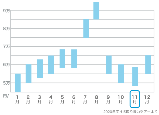 1年を通しても11月の旅費はかなりリーズナブル。レンタカー付きのツアーでも3日間で5万円前後から探すことができます。ただし「文化の日」「勤労感謝の日」の祝日にかかる日程は3~4割程度アップしますし、早めに予約をしないと希望のホテルや飛行機の時間帯は埋まってしまいます。とはいえ連休でも夏のピーク時に比べるとかなり旅費は押さえられるのでおすすめです。