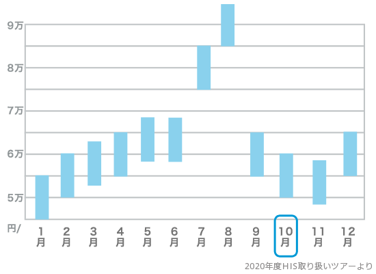 ピークシーズンが過ぎ、10月に入るとさらに旅費が下がります。3日間のツアーで5~6万円程度。月末に近づくとさらに下がることもあります。2022年以降はスポーツの日による3連休があるため、その付近の旅費は上がるでしょう。旅行会社で秋のセールなどを利用すれば、さらにお得。気候も良く価格も割安なため、1年を通して狙い目の月でもあります。