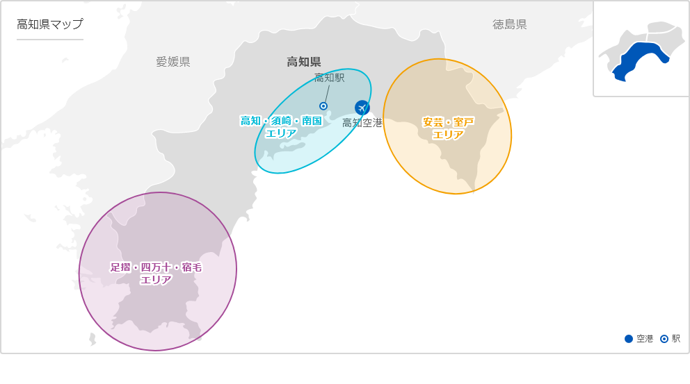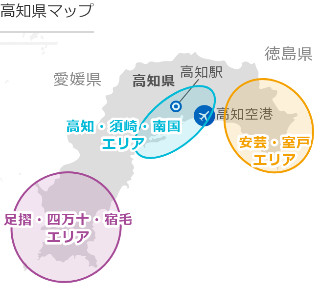 - 県内には高知龍馬空港があります。高知空港から高知駅までは空港連絡バスが走っており、約45分で到着できます。足摺や四万十、室戸などの県内の観光地へは、高知駅に出てから電車やバスを利用して移動するといいでしょう。レンタカーもおすすめです。