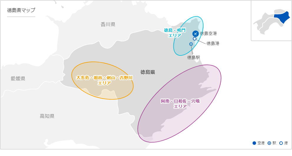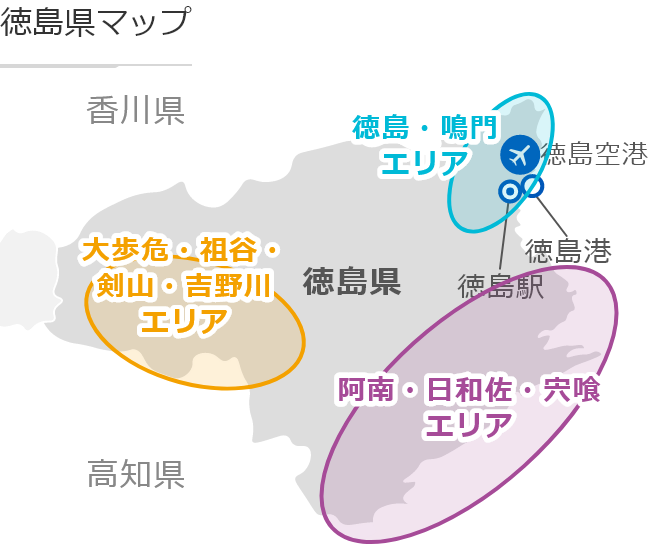 徳島阿波おどり空港があります。徳島市街から空港へのアクセスは車、リムジンバス、路線バスになります。徳島駅からリムジンバスを利用した場合の所要時間は約30分です。