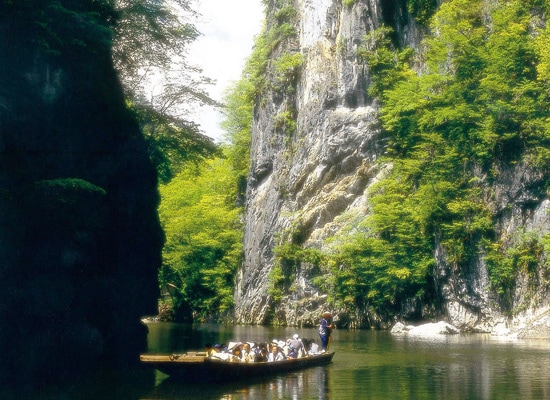 砂鉄川が石灰岩を浸食して造った全長約2キロの渓谷。高さ約100mの断崖絶壁は、多くの観光客を魅了しています。 藤の花香る春、涼風そよぐ夏、紅葉映える秋、水墨画の世界漂う冬と、四季折々の風情は、まさに癒しの空間です。