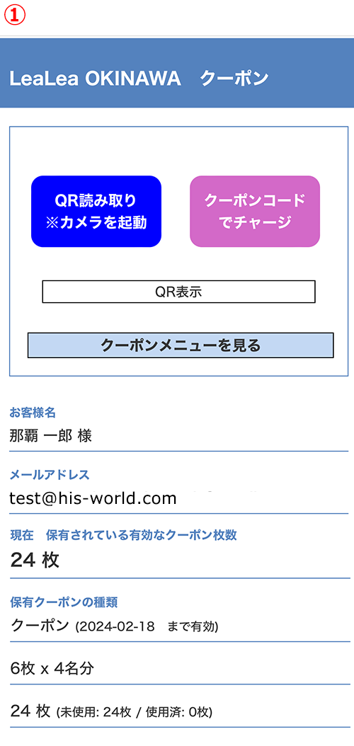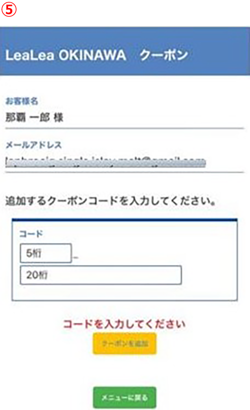 お名前・メールアドレスをご確認いただき【保有しているeクーポンの枚数 ・保有しているeクーポンの有効期間】をお確かめください。ご不明な場合はご予約の店舗または、LeaLeaラウンジOKINAWAへご連絡ください。