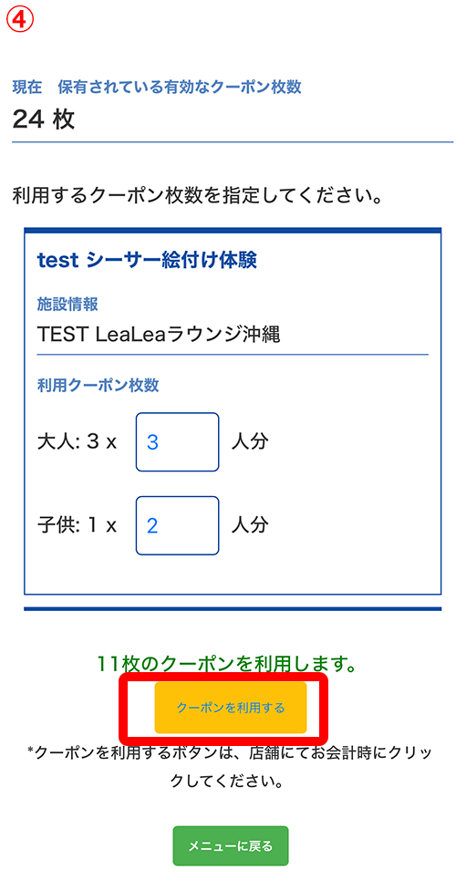 [4]ご利用のメニュー人数を選択し、保有しているクーポンを確認の上【クーポンを利用する】をクリック