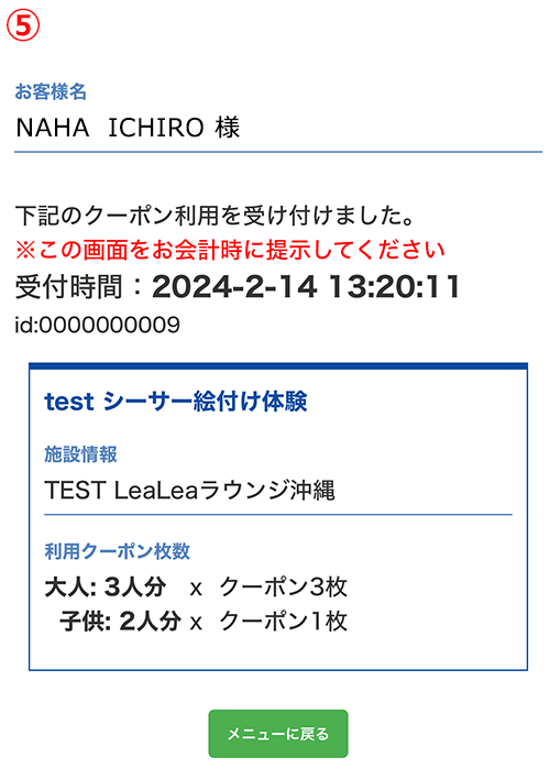 [5]受付完了の画面を施設様へご提示しご利用ください