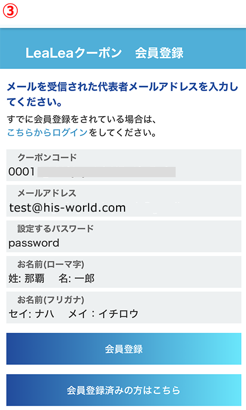 クーポンコードが事前に記載されていますので【メールアドレス・パスワード設定(英数4~8文字)・代表者名(アルファベット/カナ)】を入力。