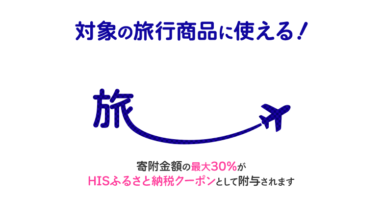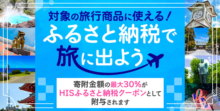 応援したい自治体や旅行先などご希望の自治体に寄附すると、HISでの国内旅行予約に使えるクーポンが返礼品として受け取れます。※1クーポン=1円。寄附金額の最大30%。
