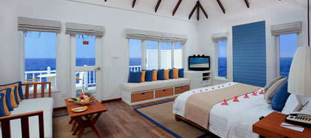 デラックスウォーターヴィラ 白を基調としたさわやかでかわいらしいお部屋。1棟2部屋タイプながらも、隣接部分が少ないので、プライベート感を損ないません。