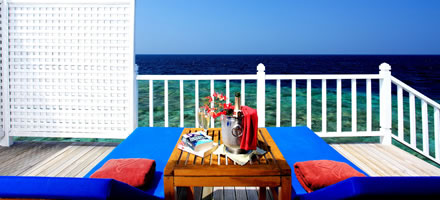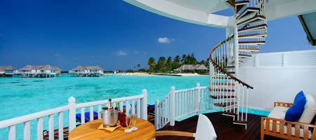 ラグジュアリー水上ヴィラアイランドクラブ 2階のサンデッキからの眺めは抜群!夜にはきれいな星空を眺めるのにも最適です。ワンランク上の滞在とサービスが楽しめるアイランド・クラブのお部屋。