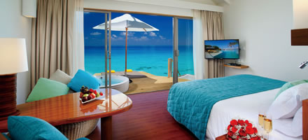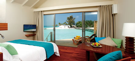 デラックス水上ヴィラ 落ち着いた色調のデザインの中に、水色が目を引くさわやかな客室。サンデッキから直接海にアクセス出来ます。