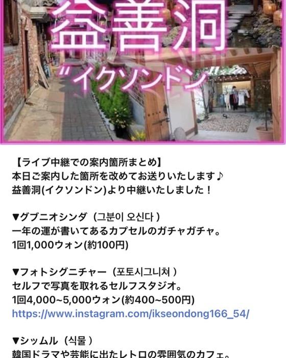 最後に訪れたのがコロナ流行前の2019年の10月でした。バーチャル上映で久しぶりに様子が見られてとても懐かしく、新しい店舗も増えていたのでコロナが終息したら直ぐに行きたいと思いました。今回紹介して下さったテテロッサロンの韓服やシッムルのアルコール入りのコーヒーを飲んでみたいとも思ったし、ダブニオシンダンは利用方法が分からなく眺めて諦めた所なので、今回詳しく説明して頂けたので是非チャレンジしてみます。